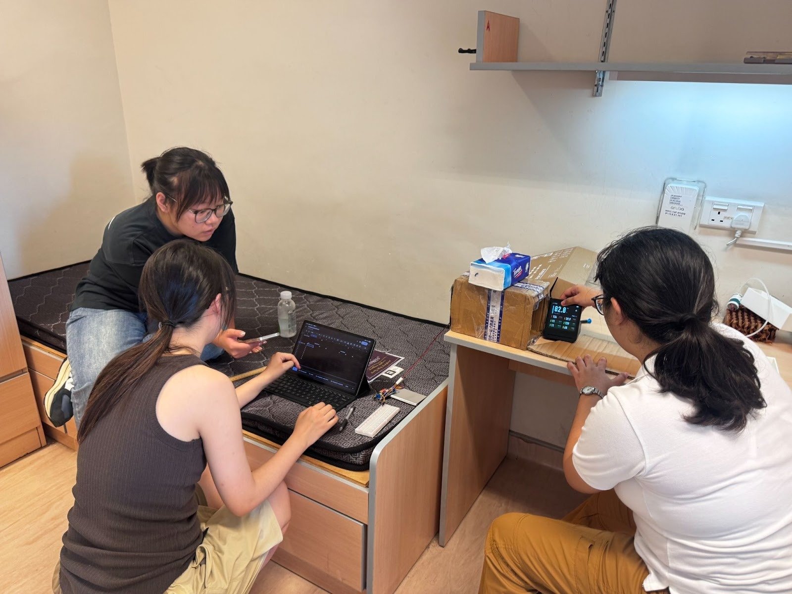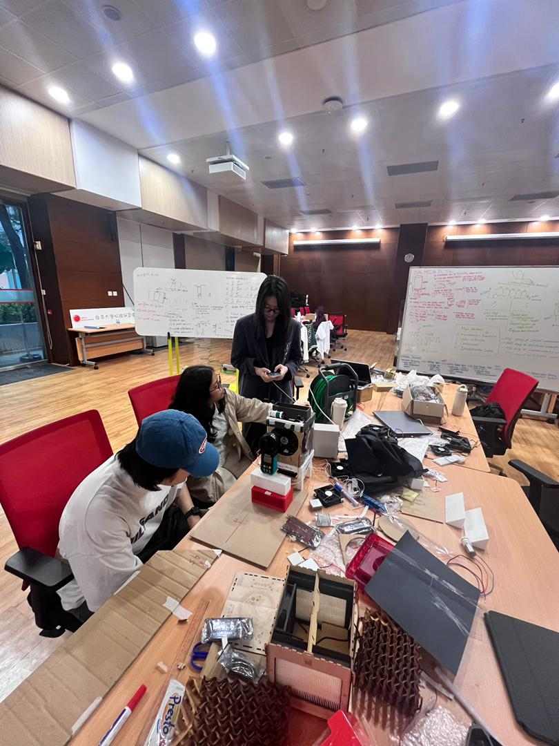 项目初期,为精准把握需求,同学们实地探访了“劏房博物馆”,亲眼目睹了香港地区低收入群体的居住现状,6 平方米模拟空间内双层床与迷你冰箱挤占大半空间、密不透风的环境,让大家深刻意识到 “技术不能是橱窗展品,要扎根真实生活”。“真实环境比博物馆呈现的还要恶劣得多,我们设计的不仅是一个产品,更是一份对尊严的守护”黄浩钏感慨道。