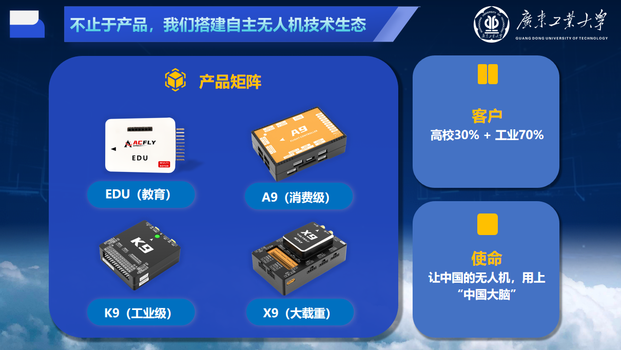 目前,陈顺成团队已构建起覆盖教育、培训、行业应用的全生态产品矩阵:EDU系列作为全国大学生电子设计大赛指定平台,已累计培养超5000名学生;A9系列服务于无人机驾驶员培训与职业院校实训;K9系列在测绘、巡检、应急救援等领域广受好评;X9系列采用全国产硬件方案,适用于大载重物流场景。团队还发起“星源计划”公益项目,培养广工新一代飞控人才;参与学校“创业牵手计划”孵化在校生企业;并向母校捐赠100万元设立“博睿创新创业基金”,持续反哺低空经济领域人才培养。