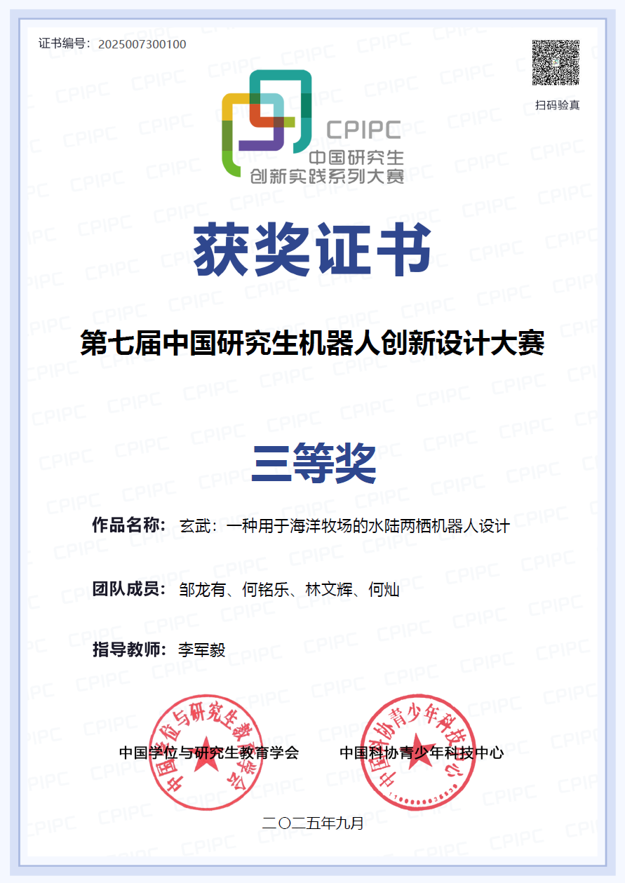 近日,中国研究生创新实践系列大赛——第七届中国研究生机器人创新设计大赛成功举办。本届赛事共吸引全国224家研究生培养单位的1640支队伍报名参与,其中325支队伍挺进决赛环节。经过实机展示与现场答辩的激烈角逐,自动化学院海洋智能无人系统实验室李军毅老师指导的学生团队表现优异,成功晋级全国总决赛并最终荣获全国三等奖。