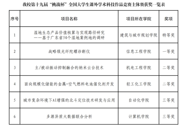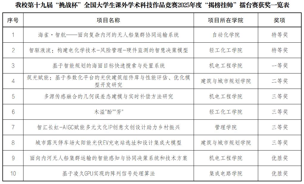 11月3日,第十九届“挑战杯”全国大学生课外学术科技作品竞赛终审决赛在南京大学圆满落幕。我校选送的作品荣获主体赛特等奖1项、一等奖1项、二等奖2项、三等奖2项;2025年度“揭榜挂帅”擂台赛特等奖2项、一等奖1项、二等奖1项、三等奖4项、优胜奖2项;2024年度“揭榜挂帅”专项赛特等奖1项、一等奖1项、二等奖5项、三等奖3项。